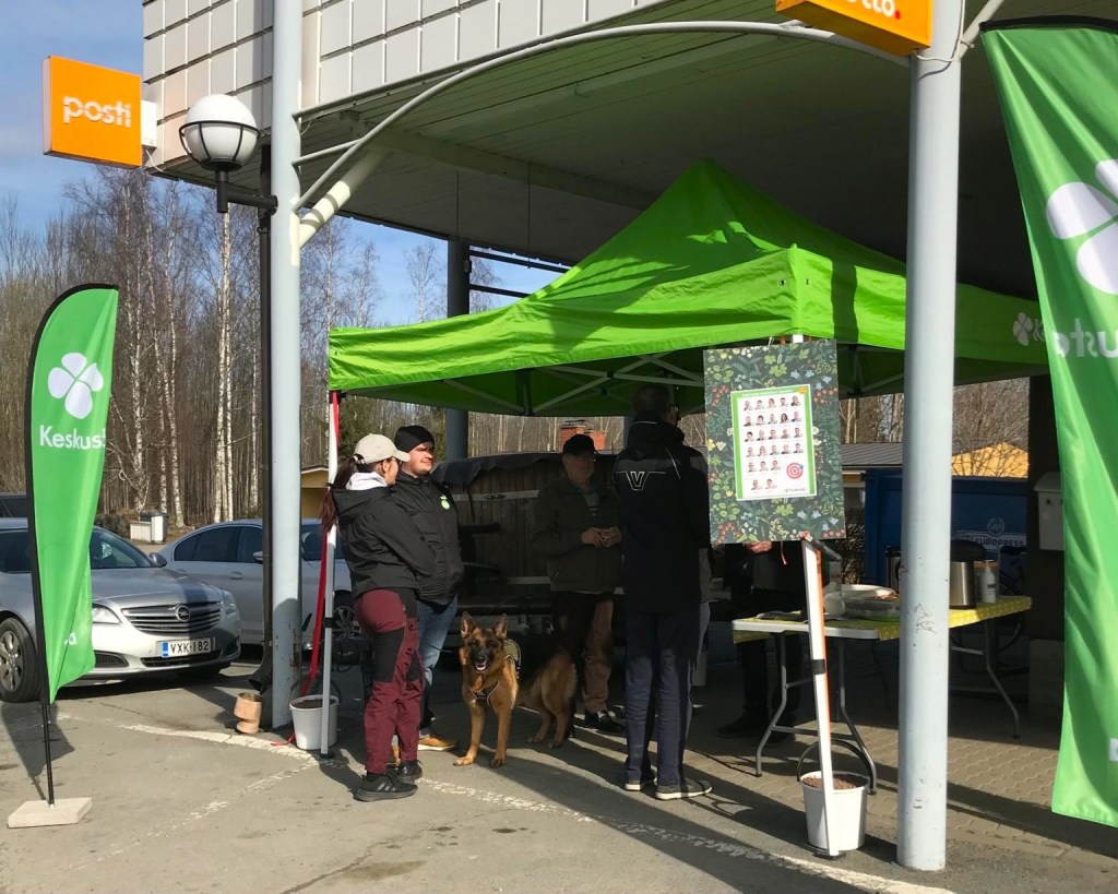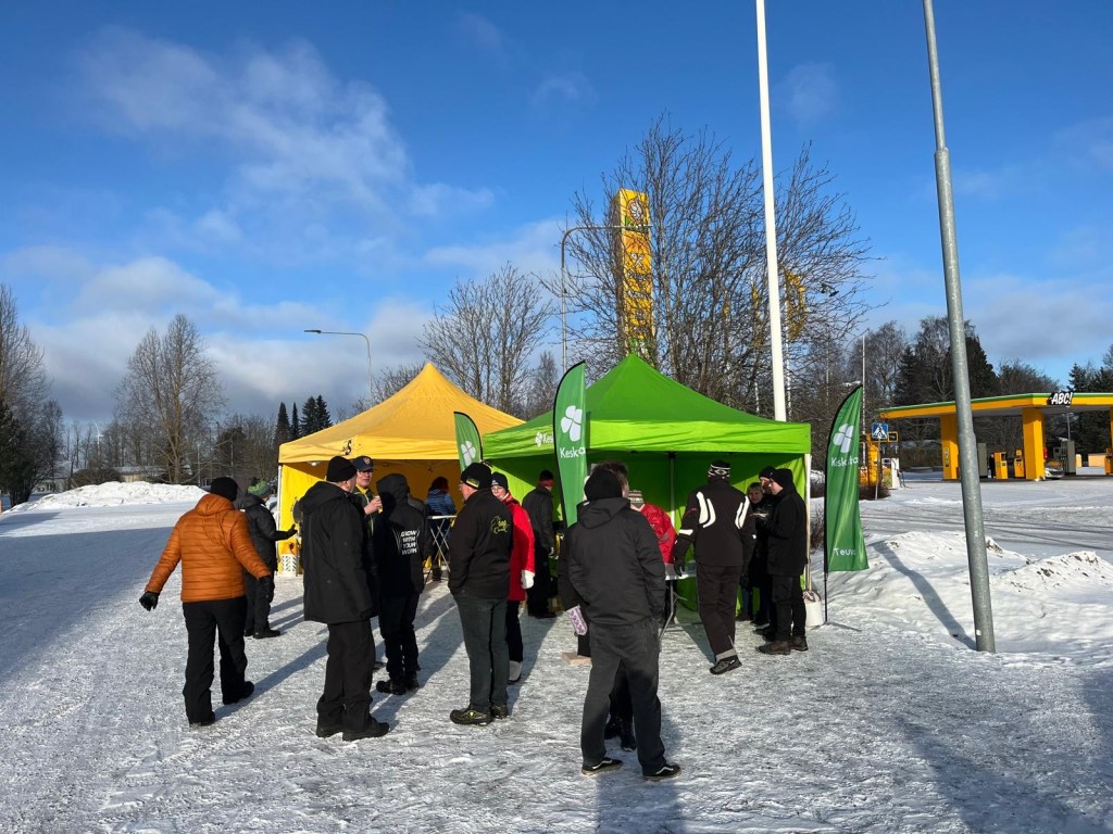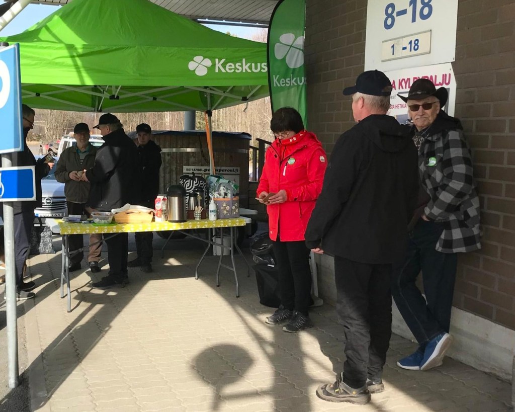 La 15.2. Keskustan vaaliteltta S-Marketin edustalla. Tarjolla hernekeittoa, paikalla ehdokkaita.