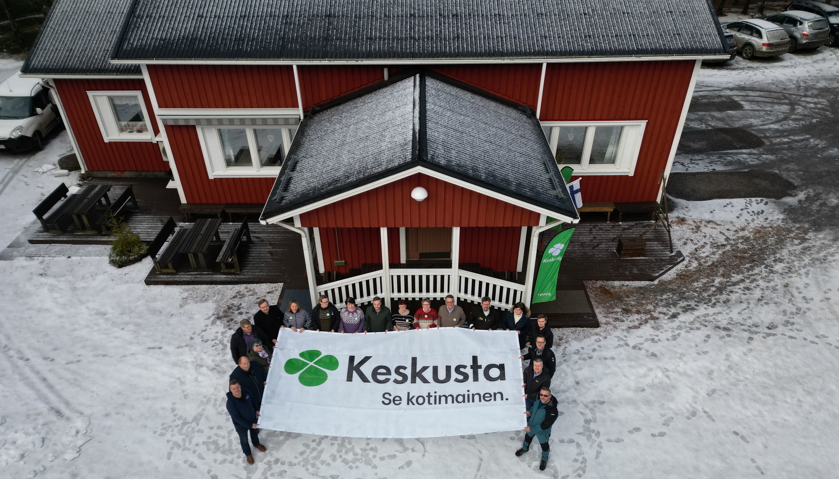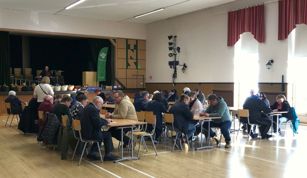 Pappilankankaan laskiaissunnuntain tapahtumassa oli tupa täynnä väkeä. Hernekeitto ja pannari maistui ja mielenkiinnolla kuunneltiin eduskuntaryhmän pj Antti Kurvisen ajankohtaiskatsausta sekä maailman- että oman maamme politiikasta. Lopuksi paikalla olleet ehdokkaat kerääntyivät ryhmäkuvaan, jonka Samu Laitila otti dronella.